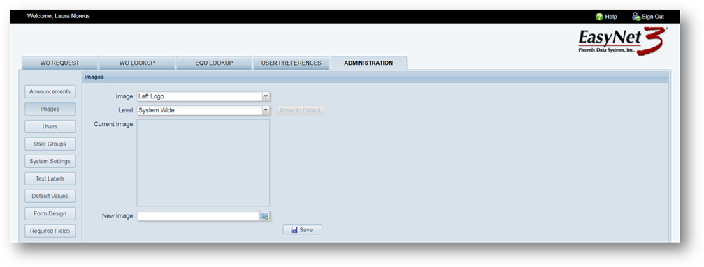 Add your logo to EasyNet 3 screens and/or add an image to the login screen.