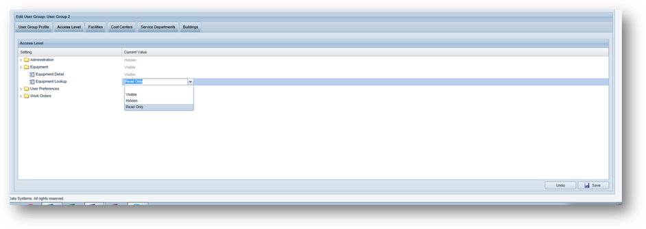 1. Table – Expand each section in the table and select whether each item will be “visible”, “hidden” or “read only” for members of the Group.