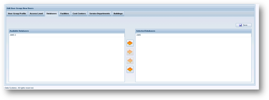 •To remove databases from User Group access, highlight the database in the Selected Databases table, and click the left-pointing arrow.