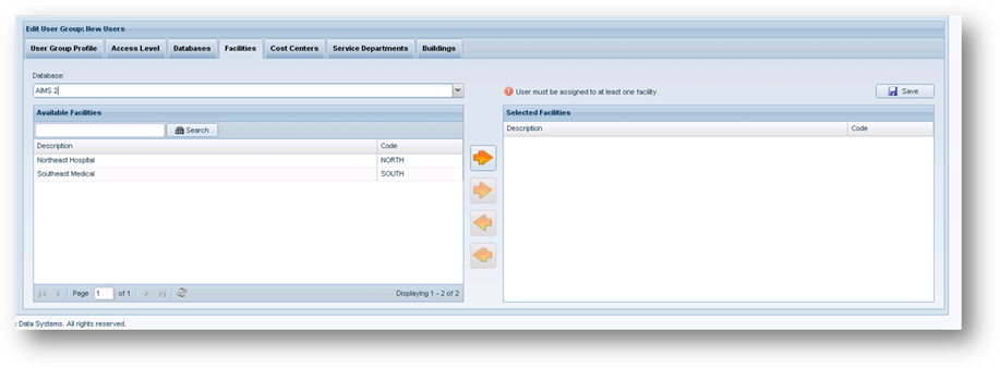 •To remove facilities from User Group access, highlight the facility in the Selected Facilities table, and click the left-pointing arrow.