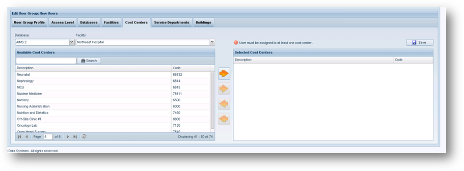 •To remove Cost Centers from User Group access, highlight the Cost Center in the Selected Cost Centers table, and click the left-pointing arrow.