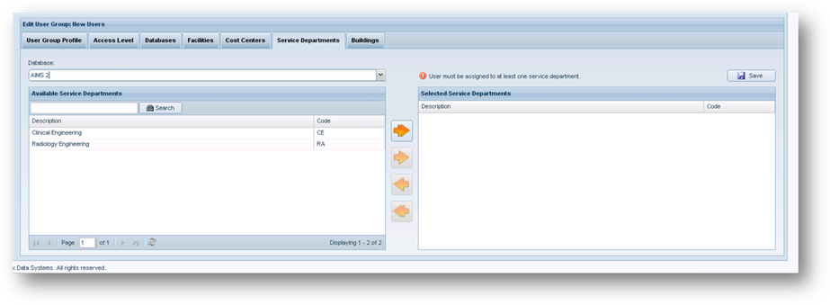 •To remove Service Departments from User Group access, highlight the Service Department in the Selected Service Departments table, and click the left-pointing arrow.