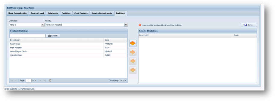 •To remove Buildings from User Group access, highlight the Building in the Selected Buildings table, and click the left-pointing arrow.