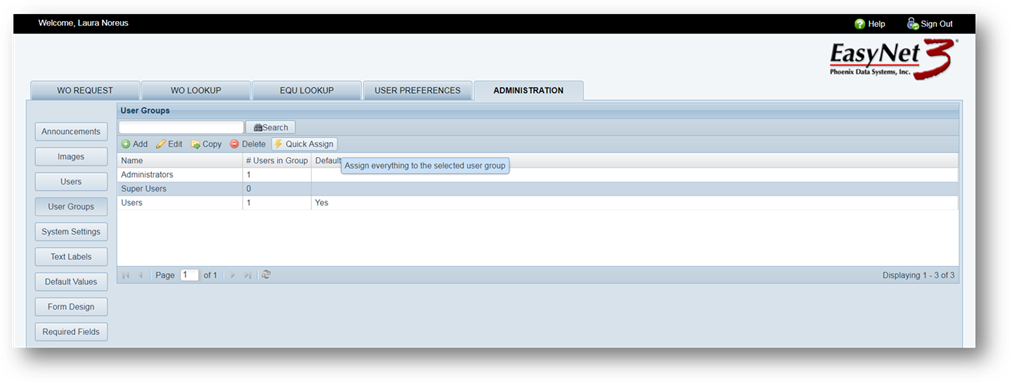 Create Group Names and set up the ability for members of those groups to access selected sections in EasyNet 3 as well as Databases, Facilities, Cost Centers, Service Departments and Buildings.